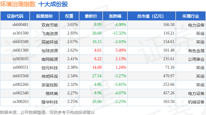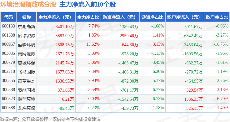 资金流向方面,环境治理(399806)指数成份股当日主力资金净流出合计12.56亿元,游资资金净流入合计2.22亿元,散户资金净流入合计10.35亿元。成份股资金流向详情见下表: