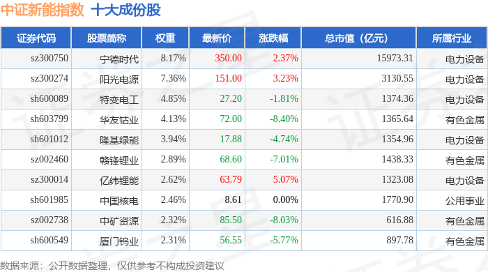 中证新能(399808)指数十大成份股详情如下: