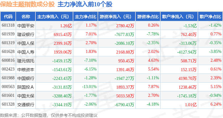 资金流向方面,保险主题(399809)指数成份股当日主力资金净流出合计7.63亿元,游资资金净流入合计5993.27万元,散户资金净流入合计7.03亿元。成份股资金流向详情见下表: