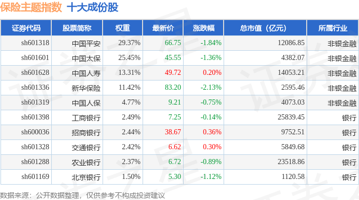 证券之星消息,1月30日,保险主题(399809)指数报收于2754.67点,跌1.21%,成交366.74亿元,换手率0.26%。当日该指数成份股中,上涨的有3家,招商银行以0.36%的涨幅领涨,下跌的有14家,中粮资本以2.66%的跌幅领跌。