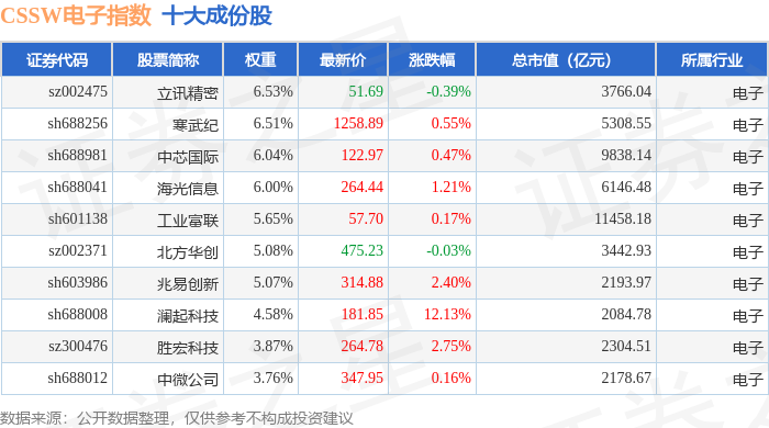 证券之星消息,1月30日,CSSW电子(399811)指数报收于6208.63点,涨1.0%,成交1770.35亿元,换手率2.68%。当日该指数成份股中,上涨的有29家,澜起科技以12.13%的涨幅领涨,下跌的有31家,蓝思科技以3.17%的跌幅领跌。