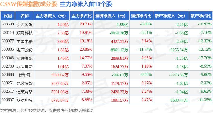 资金流向方面,CSSW传媒(399810)指数成份股当日主力资金净流出合计38.56亿元,游资资金净流入合计20.35亿元,散户资金净流入合计18.21亿元。成份股资金流向详情见下表: