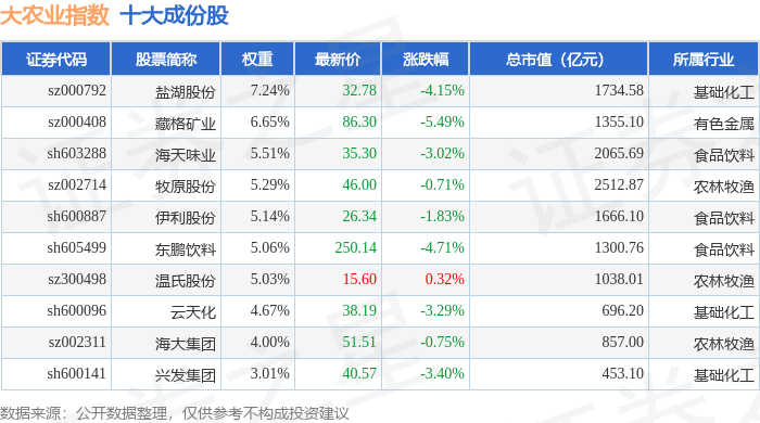 大农业(399814)指数十大成份股详情如下: