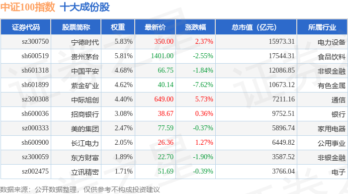 证券之星消息,1月30日,中证100(399903)指数报收于4615.93点,跌1.04%,成交4329.26亿元,换手率1.21%。当日该指数成份股中,上涨的有27家,澜起科技以12.13%的涨幅领涨,下跌的有71家,中国铝业以10.0%的跌幅领跌。