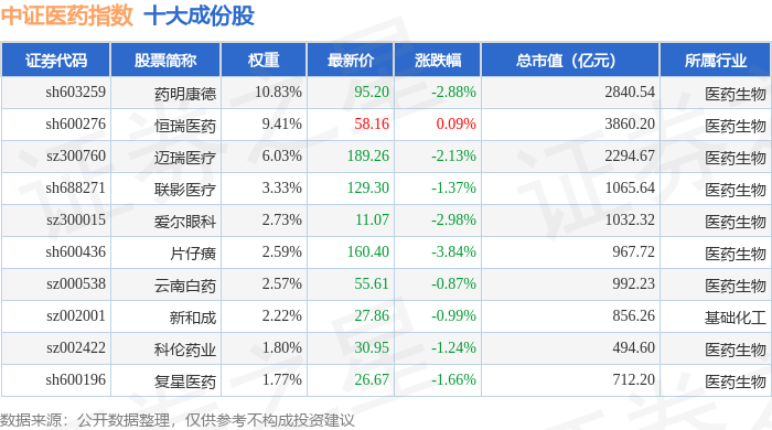 资金流向方面,中证医药(399933)指数成份股当日主力资金净流出合计13.82亿元,游资资金净流入合计10.19亿元,散户资金净流入合计3.63亿元。成份股资金流向详情见下表: