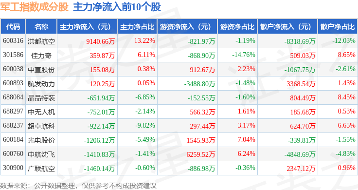 资金流向方面,军工指数(399959)成份股当日主力资金净流出合计33.96亿元,游资资金净流入合计6.11亿元,散户资金净流入合计27.85亿元。成份股资金流向详情见下表: