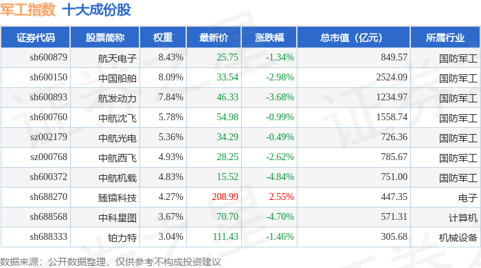 军工指数(399959)十大成份股详情如下: