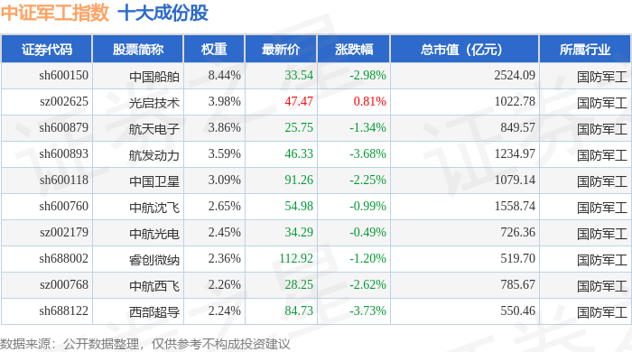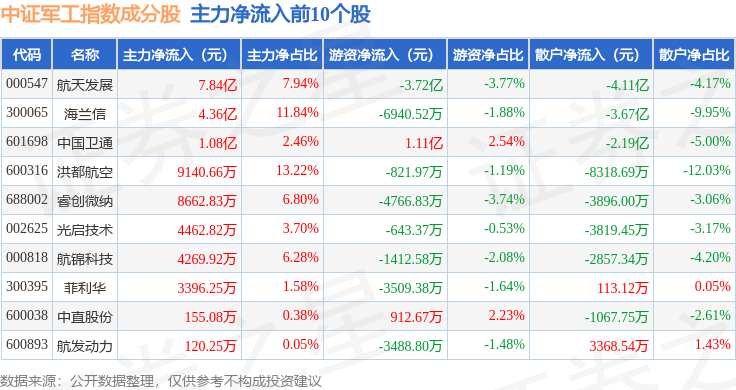 资金流向方面,中证军工(399967)指数成份股当日主力资金净流出合计56.26亿元,游资资金净流入合计7.41亿元,散户资金净流入合计48.85亿元。成份股资金流向详情见下表: