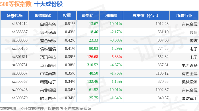 证券之星消息,1月30日,500等权(399982)指数报收于9980.98点,跌1.61%,成交6004.97亿元,换手率2.94%。当日该指数成份股中,上涨的有95家,太辰光以12.91%的涨幅领涨,下跌的有396家,云南铜业以10.01%的跌幅领跌。