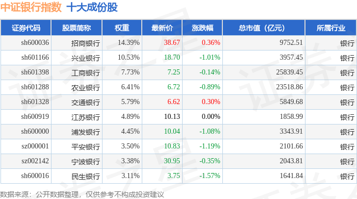 中证银行(399986)指数十大成份股详情如下: