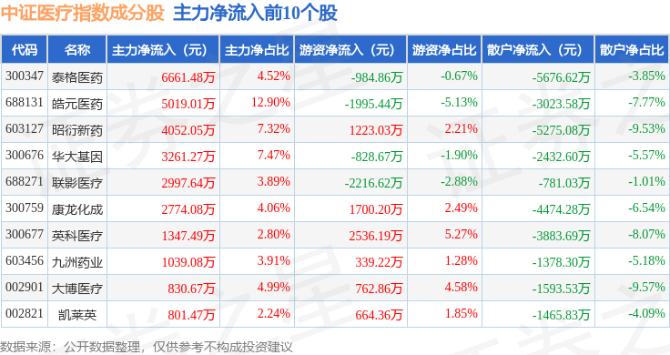 资金流向方面,中证医疗(399989)指数成份股当日主力资金净流出合计12.79亿元,游资资金净流入合计6.33亿元,散户资金净流入合计5.9亿元。成份股资金流向详情见下表: