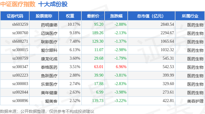 证券之星消息,1月30日,中证医疗(399989)指数报收于7085.3点,跌1.52%,成交250.63亿元,换手率2.29%。当日该指数成份股中,上涨的有11家,泰格医药以6.96%的涨幅领涨,下跌的有38家,卫宁健康以4.58%的跌幅领跌。