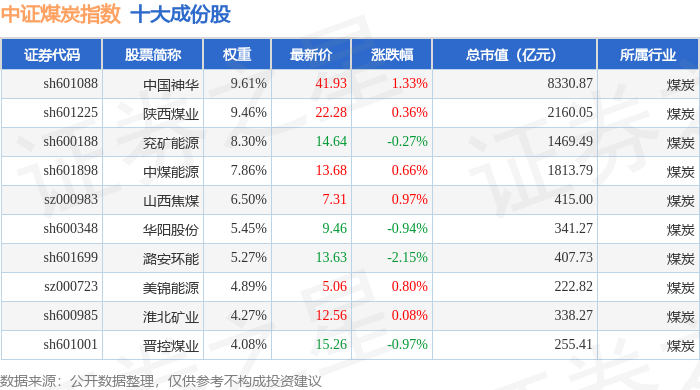 中证煤炭(399998)指数十大成份股详情如下: