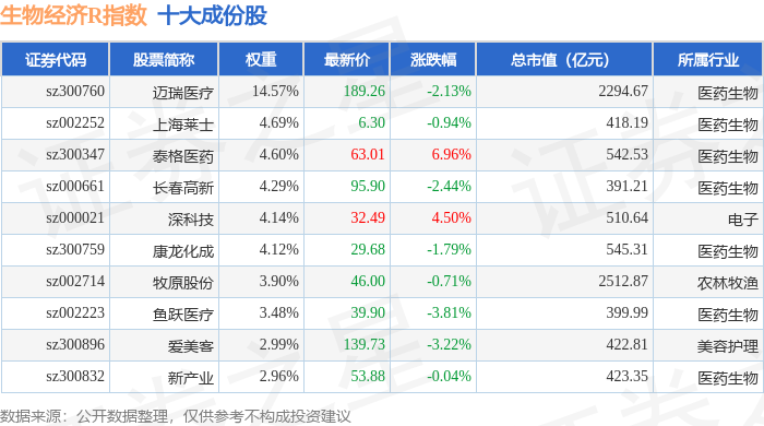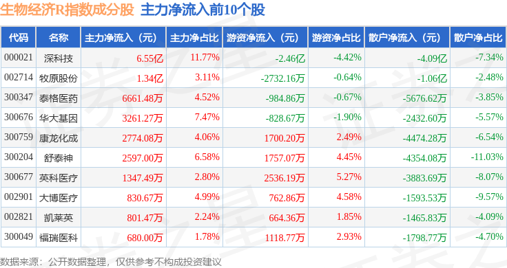 资金流向方面,生物经济R(470038)指数成份股当日主力资金净流出合计6917.85万元,游资资金净流入合计1.34亿元,散户资金净流出合计6463.37万元。成份股资金流向详情见下表: