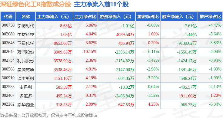 资金流向方面,深证绿色化工R(470076)指数成份股当日主力资金净流出合计18.6亿元,游资资金净流入合计6.53亿元,散户资金净流入合计12.07亿元。成份股资金流向详情见下表: