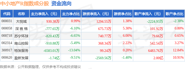 资金流向方面,中小地产R(471002)指数成份股当日主力资金净流出合计2.56亿元,游资资金净流入合计609.08万元,散户资金净流入合计2.5亿元。成份股资金流向详情见下表: