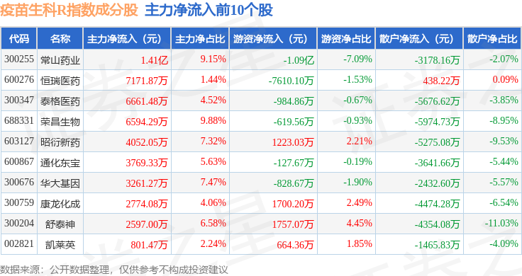 资金流向方面,疫苗生科R(480015)指数成份股当日主力资金净流出合计5.33亿元,游资资金净流入合计4.79亿元,散户资金净流入合计5451.16万元。成份股资金流向详情见下表: