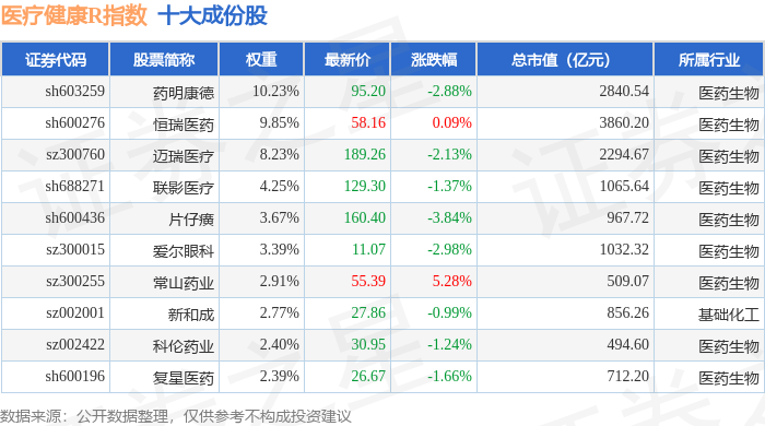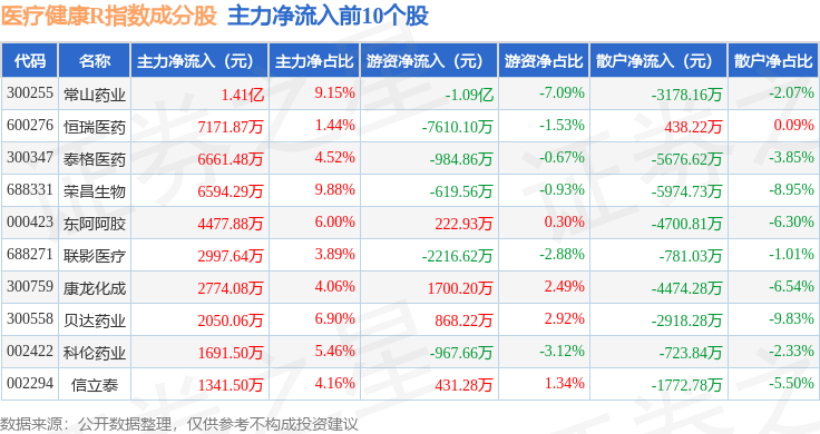 资金流向方面,医疗健康R(480016)指数成份股当日主力资金净流出合计7.43亿元,游资资金净流入合计5.47亿元,散户资金净流入合计1.96亿元。成份股资金流向详情见下表: