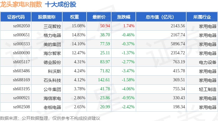 证券之星消息,1月30日,龙头家电R(480028)指数报收于19897.44点,跌0.6%,成交215.7亿元,换手率1.46%。当日该指数成份股中,上涨的有9家,禾盛新材以4.95%的涨幅领涨,下跌的有21家,公牛集团以4.06%的跌幅领跌。