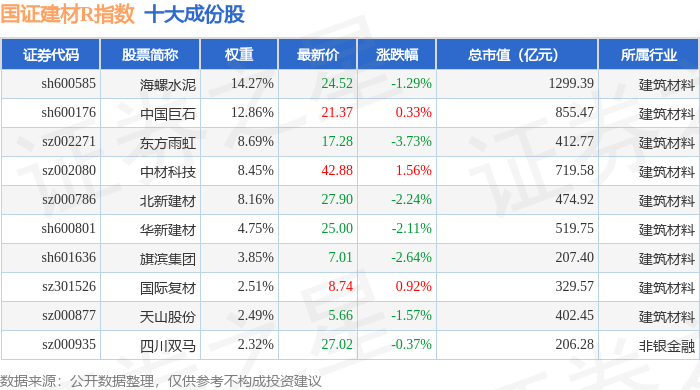 国证建材R(480048)指数十大成份股详情如下: