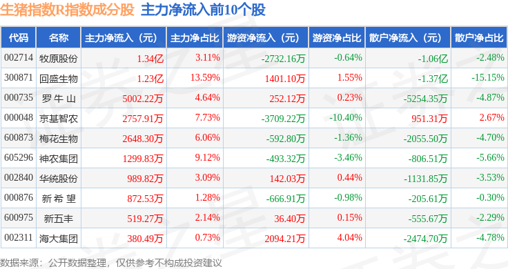 资金流向方面,生猪指数R(480073)指数成份股当日主力资金净流出合计1.29亿元,游资资金净流入合计8370.45万元,散户资金净流入合计4548.43万元。成份股资金流向详情见下表: