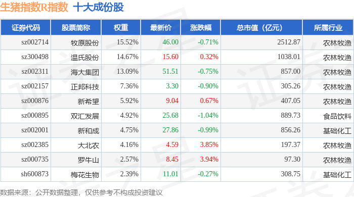 生猪指数R(480073)指数十大成份股详情如下: