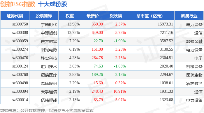 创指ESG(970028)指数十大成份股详情如下: