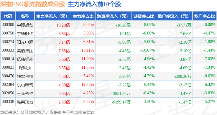 资金流向方面,深指ESG领先(970029)指数成份股当日主力资金净流出合计98.8亿元,游资资金净流出合计2.17亿元,散户资金净流入合计100.97亿元。成份股资金流向详情见下表: