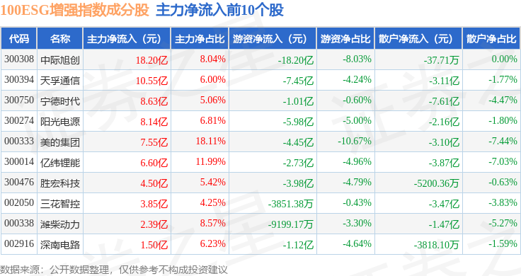 资金流向方面,100ESG增强(970033)指数成份股当日主力资金净流入合计40.57亿元,游资资金净流出合计36.28亿元,散户资金净流出合计4.29亿元。成份股资金流向详情见下表: