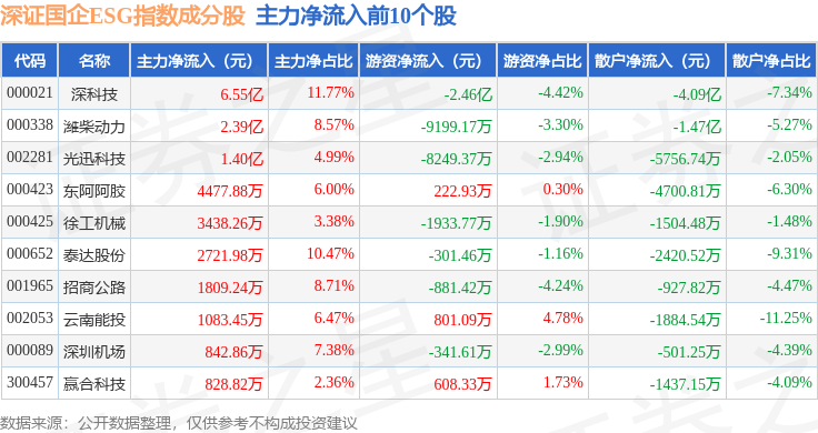 资金流向方面,深证国企ESG(970055)指数成份股当日主力资金净流出合计15.35亿元,游资资金净流入合计1.18亿元,散户资金净流入合计14.17亿元。成份股资金流向详情见下表: