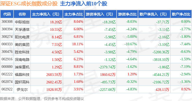 资金流向方面,深证ESG成长(970060)指数成份股当日主力资金净流入合计14.65亿元,游资资金净流出合计33.57亿元,散户资金净流入合计18.92亿元。成份股资金流向详情见下表:
