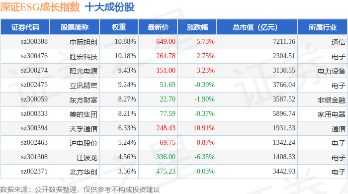 深证ESG成长(970060)指数十大成份股详情如下: