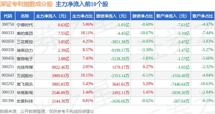资金流向方面,深证专利(970067)指数成份股当日主力资金净流出合计26.13亿元,游资资金净流入合计5.69亿元,散户资金净流入合计20.44亿元。成份股资金流向详情见下表: