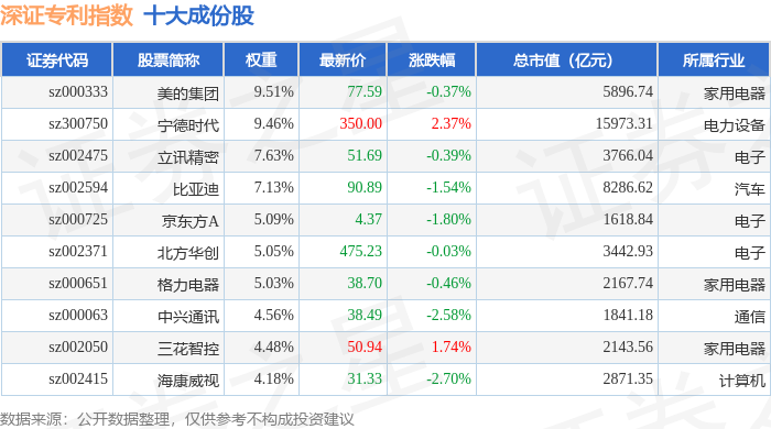 深证专利(970067)指数十大成份股详情如下:
