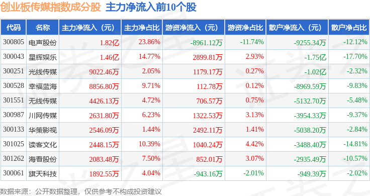 资金流向方面,创业板传媒(970084)指数成份股当日主力资金净流出合计21.78亿元,游资资金净流入合计13.1亿元,散户资金净流入合计8.69亿元。成份股资金流向详情见下表: