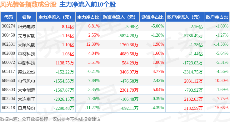 资金流向方面,风光装备(980026)指数成份股当日主力资金净流出合计27.32亿元,游资资金净流出合计1.89亿元,散户资金净流入合计29.21亿元。成份股资金流向详情见下表: