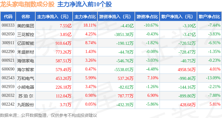 资金流向方面,龙头家电(980028)指数成份股当日主力资金净流入合计9.33亿元,游资资金净流出合计4.5亿元,散户资金净流出合计4.82亿元。成份股资金流向详情见下表: