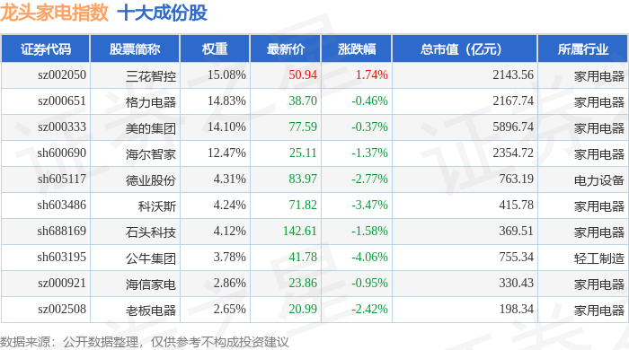 龙头家电(980028)指数十大成份股详情如下: