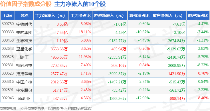 资金流向方面,价值因子(980056)指数成份股当日主力资金净流出合计9.47亿元,游资资金净流入合计1.21亿元,散户资金净流入合计8.26亿元。成份股资金流向详情见下表: