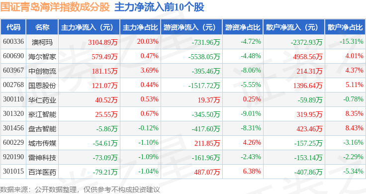 资金流向方面,国证青岛海洋(980532)指数成份股当日主力资金净流出合计4.19亿元,游资资金净流出合计1214.59万元,散户资金净流入合计4.29亿元。成份股资金流向详情见下表: