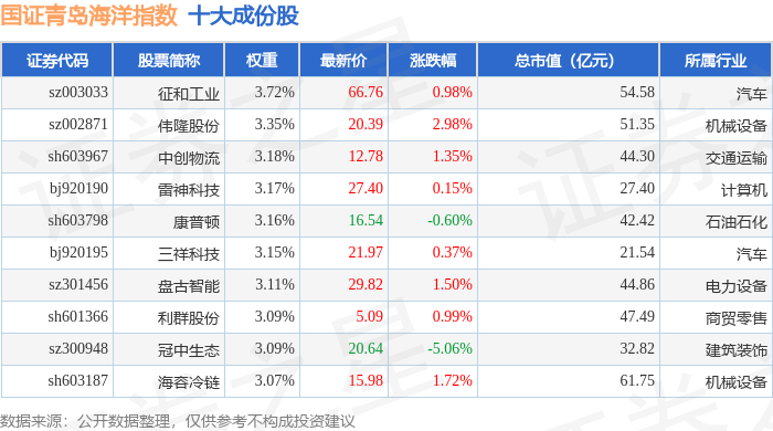 国证青岛海洋(980532)指数十大成份股详情如下: