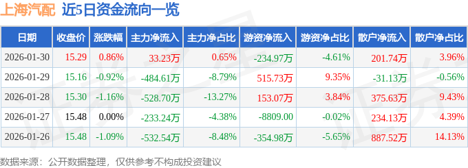 证券之星消息,截至2026年1月30日收盘,上海汽配(603107)报收于15.29元,上涨0.86%,换手率1.54%,成交量3.35万手,成交额5099.87万元。