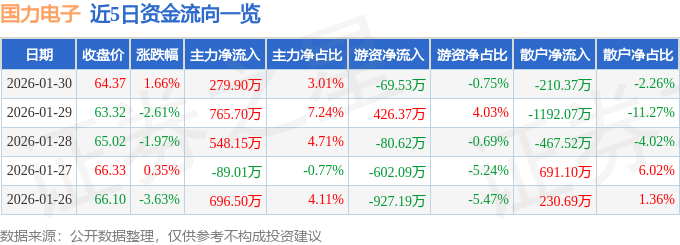 证券之星消息,截至2026年1月30日收盘,国力电子(688103)报收于64.37元,上涨1.66%,换手率1.54%,成交量1.47万手,成交额9307.16万元。