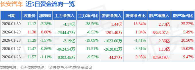 证券之星消息,截至2026年1月30日收盘,长安汽车(000625)报收于11.12元,下跌2.28%,换手率1.17%,成交量96.88万手,成交额10.83亿元。