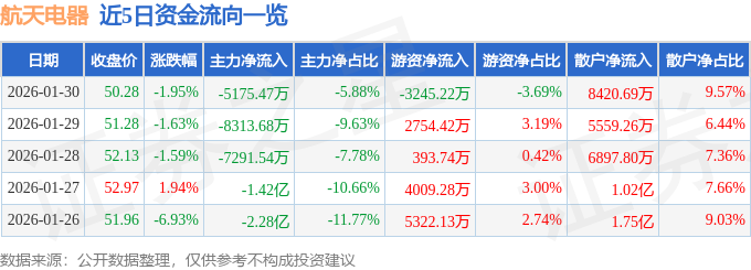 1月30日的资金流向数据方面,主力资金净流出5175.47万元,占总成交额5.88%,游资资金净流出3245.22万元,占总成交额3.69%,散户资金净流入8420.69万元,占总成交额9.57%。