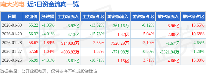 证券之星消息,截至2026年1月30日收盘,南大光电(300346)报收于55.22元,下跌1.95%,换手率8.06%,成交量52.93万手,成交额29.01亿元。