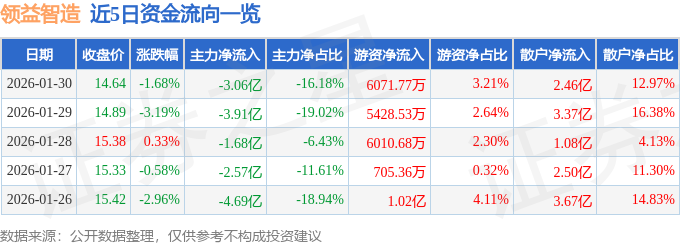 证券之星消息,截至2026年1月30日收盘,领益智造(002600)报收于14.64元,下跌1.68%,换手率1.8%,成交量129.42万手,成交额18.93亿元。