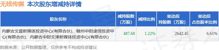 证券之星消息,1月30日无线传媒发布公告《无线传媒:关于持股5%以上股东权益变动触及1%整数倍的公告》,其股东内蒙古文盛新媒体投资中心(有限合伙)、赣州中财虔信投资中心(有限合伙)、内蒙古中财文津新媒体投资中心(有限合伙)于2026年1月13日至2026年1月29日间合计减持487.68万股,占公司目前总股本的1.2192%,变动期间该股股价上涨1.13%,截止1月29日收盘报36.71元。