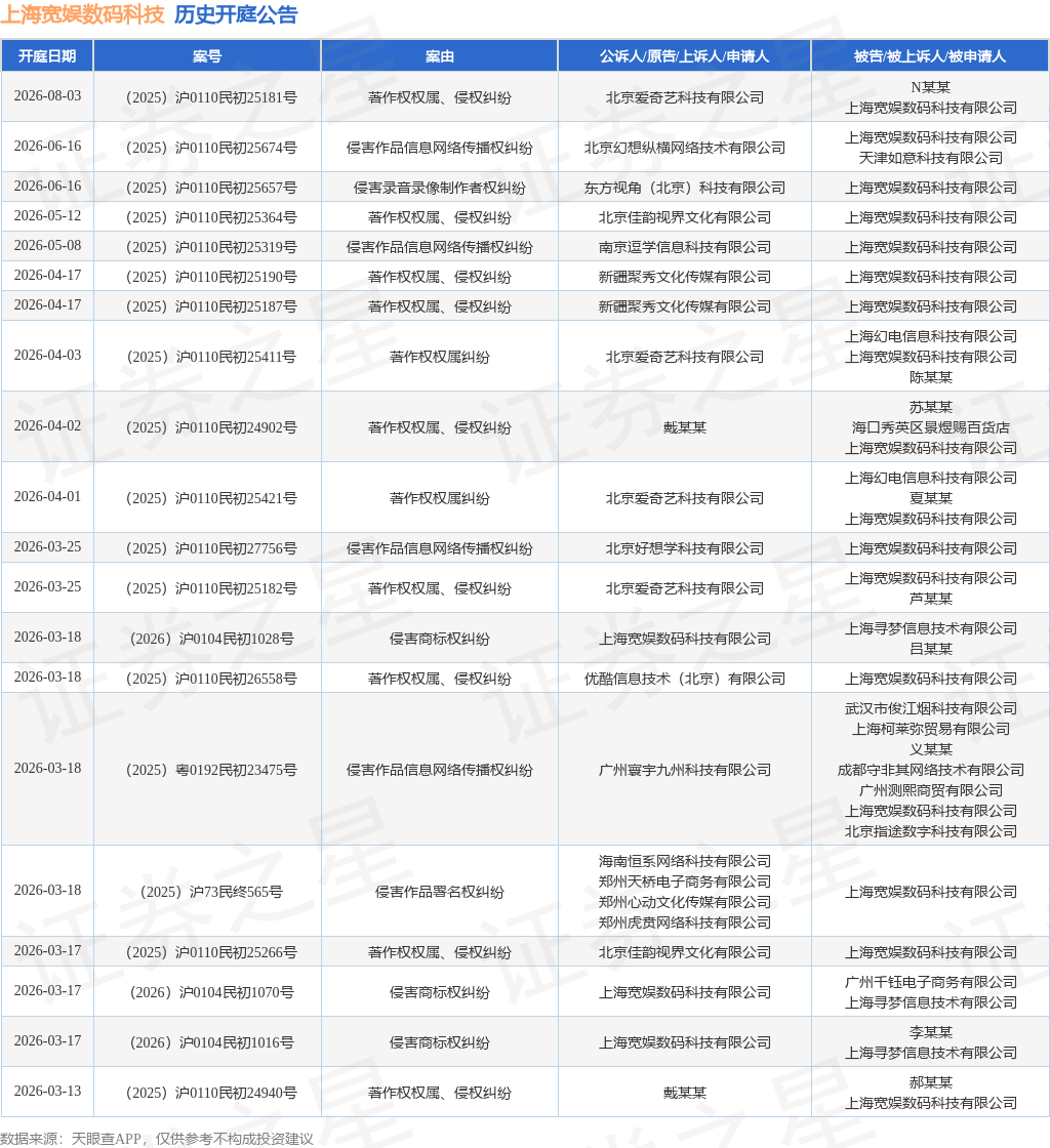 案号:(2025)沪0110民初24985号根据统计,近一年内以上海宽娱数码科技有限公司为当事人的历史开庭公告有772则,其中案由为“侵害作品信息网络传播权纠纷”的公告以338则居首,其次为“著作权权属、侵权纠纷”有149则,“网络侵权责任纠纷”有70则。历史开庭公告(前20条)如下: