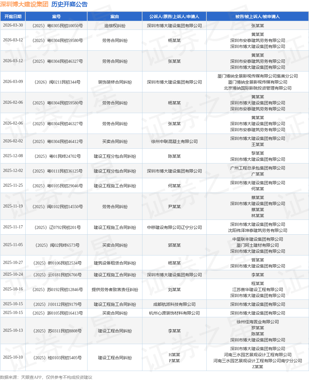 案号:(2025)粤0304民初46412号根据统计,近一年内以深圳市博大建设集团有限公司为当事人的历史开庭公告有163则,其中案由为“劳务合同纠纷”的公告以58则居首,其次为“买卖合同纠纷”有24则,“建设工程施工合同纠纷”有19则。历史开庭公告(前20条)如下: